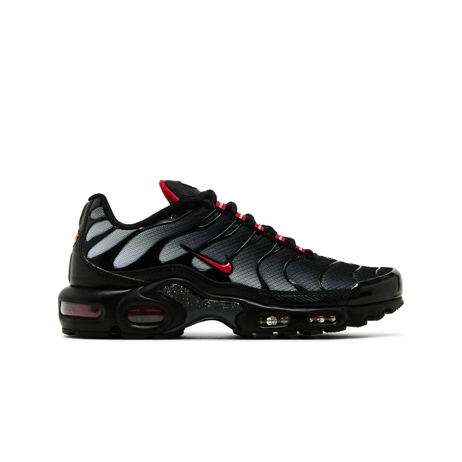 Nike Air Max Plus TN Dracula donosi tamnu, dramatičnu kombinaciju crne i sive sa upečatljivim crvenim detaljima koji modelu daju agresivan karakter. Kontrast između mračne baze i crvenog Swoosh-a stvara snažan vizuelni efekat inspirisan noćnim tonovima.
