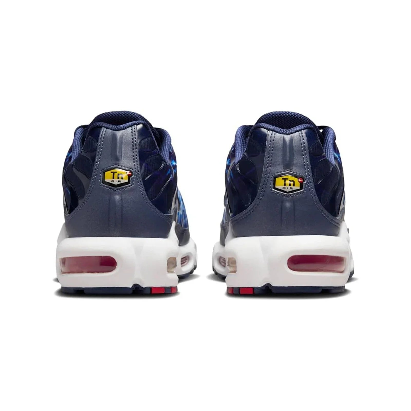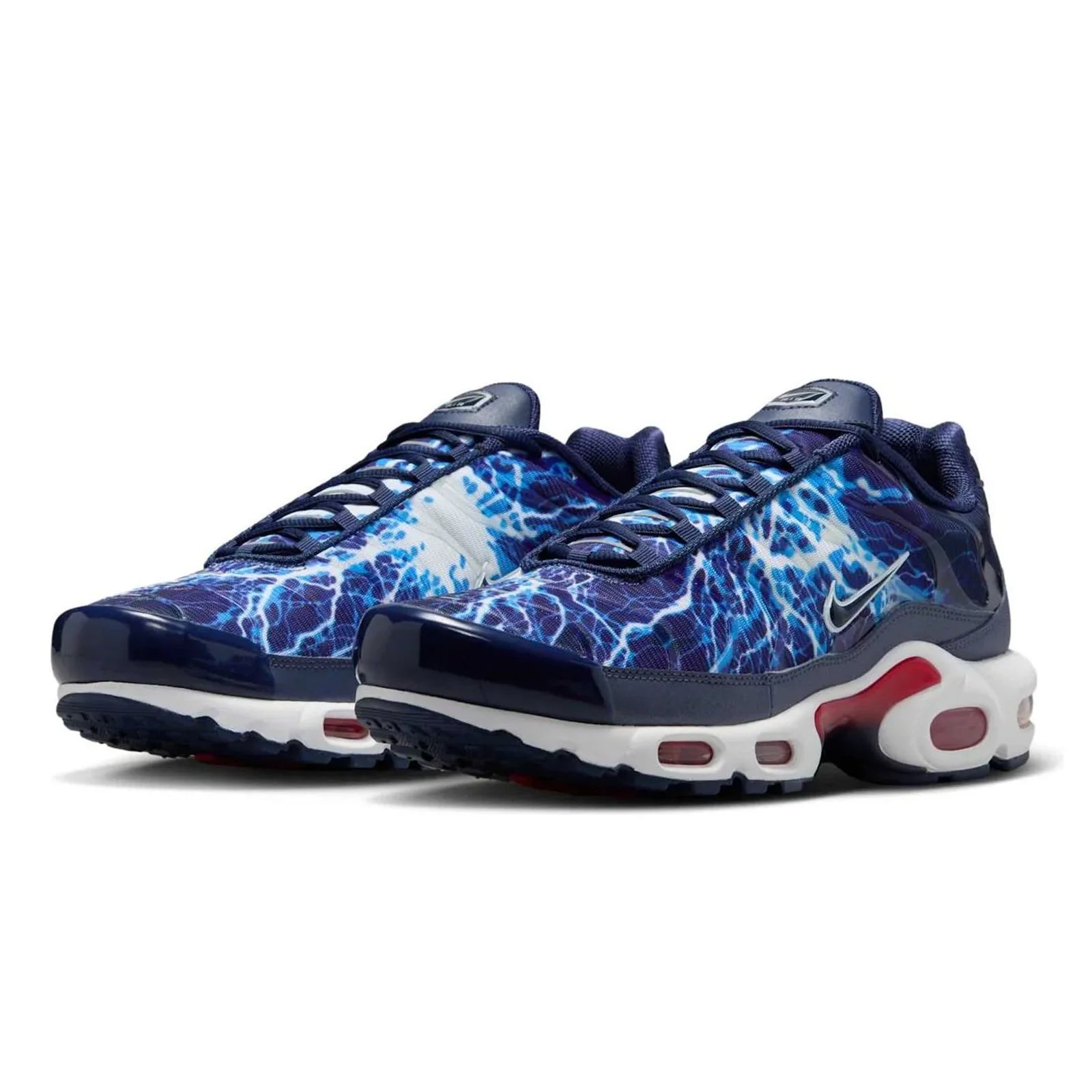 Nike Air Max Plus TN Eclair donosi energičan, električni dizajn sa plavim “lightning” printom preko gornjeg dela, uz kontrastne crvene detalje na srednjem đonu. Model kombinuje sportsku estetiku i upečatljiv grafički identitet.